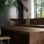 Russet browns and tarnished reds swirl together to form a raw effect, fired and seemingly scorching hot, yet embedded with an authentic aged texture that adds tactility, in Honed finish.