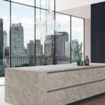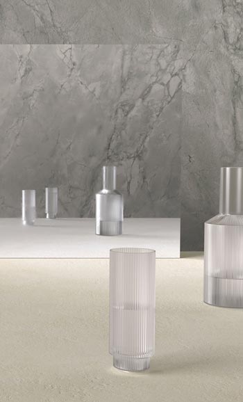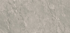 Dramatic marbling and bold veining in an organic aesthetic of dusted grey clusters surrounded by whiter areas, in a daring neutral derived from nature and softened by nuanced undertones punctuated by white highlights, in an Ultra-Rough finish.